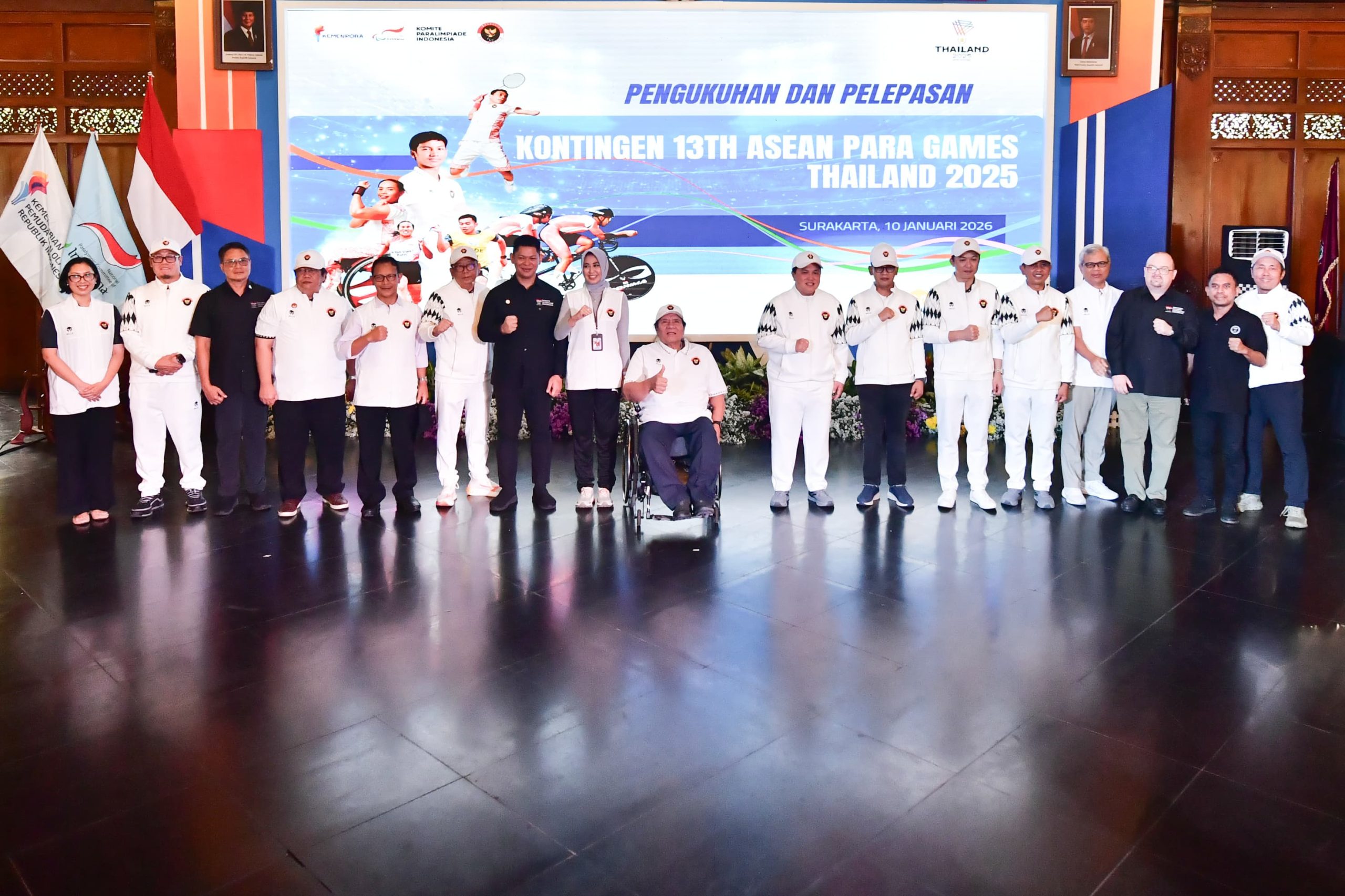 Pemerintah secara resmi mengukuhkan dan melepas Kontingen Indonesia untuk berlaga pada ASEAN Para Games Ke-13 Tahun 2025 di Thailand. Pengukuhan dilakukan oleh Menteri Pemuda dan Olahraga Republik Indonesia (Menpora RI) Erick Thohir di Balai Kota Surakarta, Sabtu (10/1/2026), (Foto Humas Kemenpora)