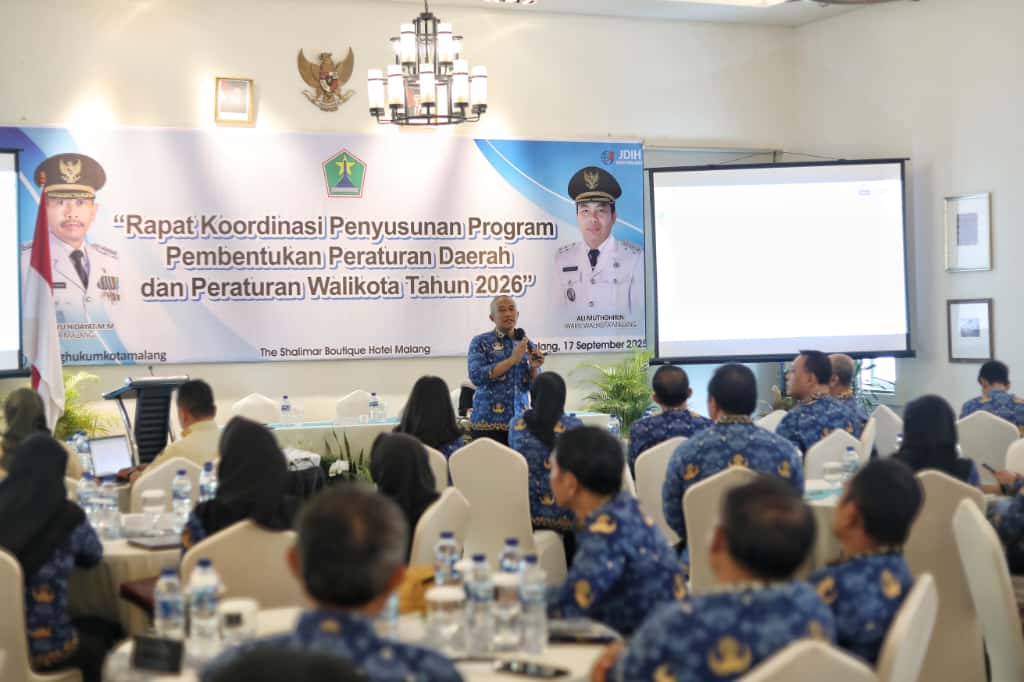 LenteraPost – Bagian Hukum Sekretariat Daerah (Setda) Kota Malang menggelar Rapat Koordinasi (Rakor) Penyusunan Program Pembentukan (Propem) Peraturan Daerah (Perda) dan Peraturan Wali Kota (Perwal) 2026 di The Shalimar Boutique Hotel Malang, Rabu (17/9/2025).