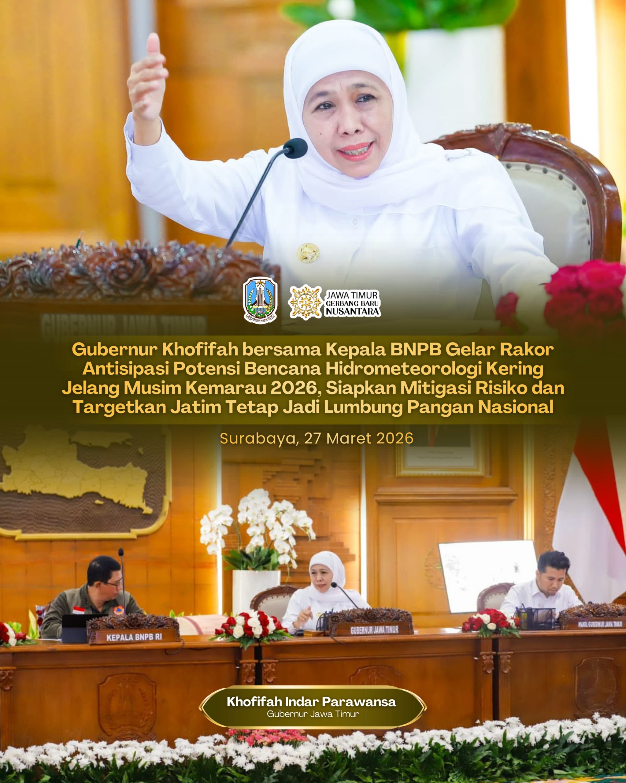 Lentera Post – SURABAYA, 28 MARET 2026, Gubernur Jawa Timur Khofifah Indar Parawansa bersama Kepala BNPB Letjen TNI Suharyanto menggelar Rapat Koordinasi (Rakor) Penanganan Dampak Bencana Hidrometeorologi dan Potensi Bencana Musim Kemarau di Gedung Negara Grahadi, Surabaya, Jumat (27/3), guna menyiapkan langkah antisipatif sekaligus memetakan risiko kekeringan menjelang musim kemarau 2026.