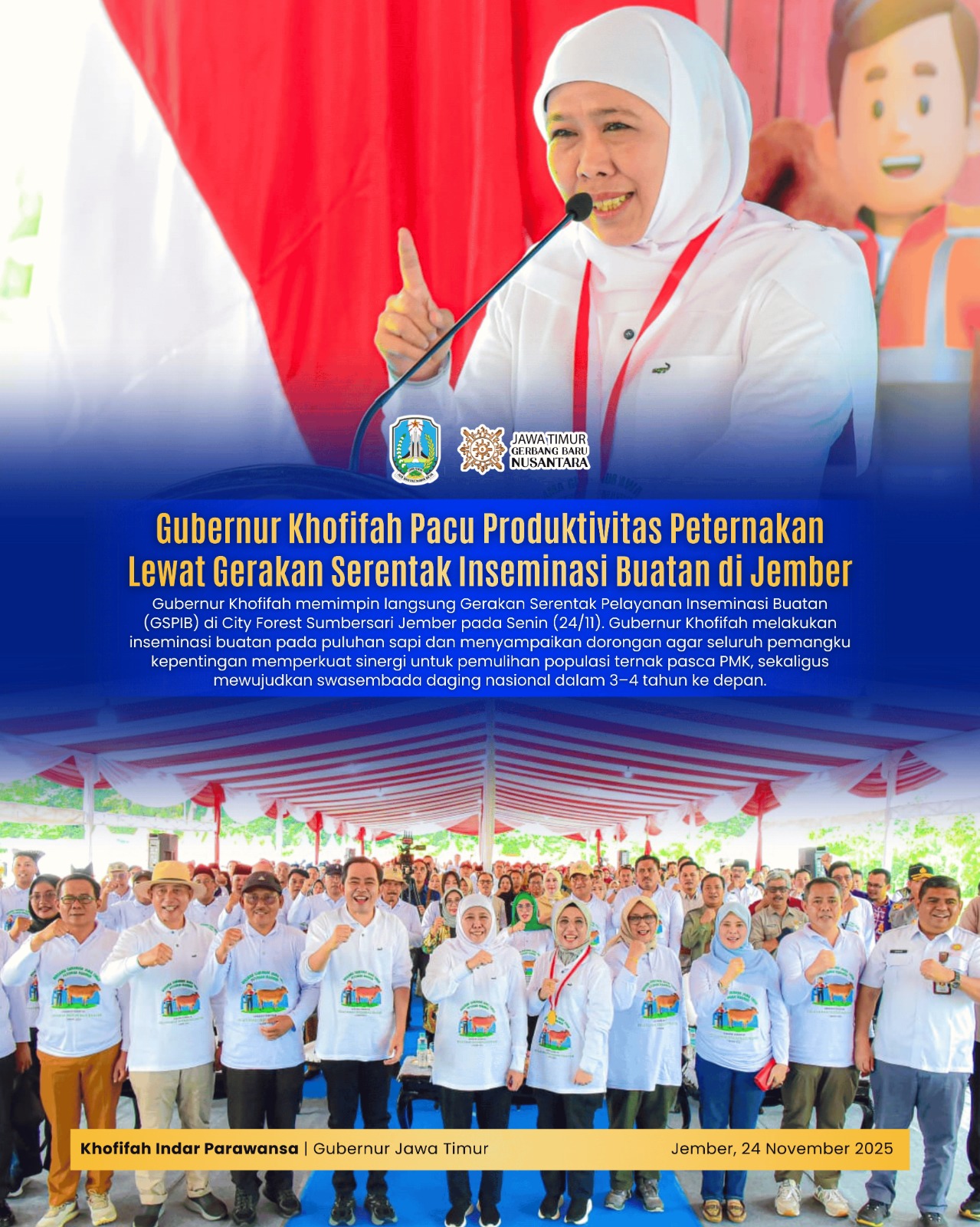 Lentera Post – JEMBER, 24 NOVEMBER 2025, Pemerintah Provinsi Jawa Timur terus memacu peningkatan produktivitas sektor peternakan melalui Gerakan Serentak Pelayanan Inseminasi Buatan (GSPIB) Tahun 2025. Kegiatan yang dipimpin langsung Gubernur Jawa Timur Khofifah Indar Parawansa itu digelar di City Forest, Kecamatan Sumbersari, Kabupaten Jember, Senin (24/11), dan turut diikuti secara serentak oleh kabupaten/kota di seluruh Jatim.