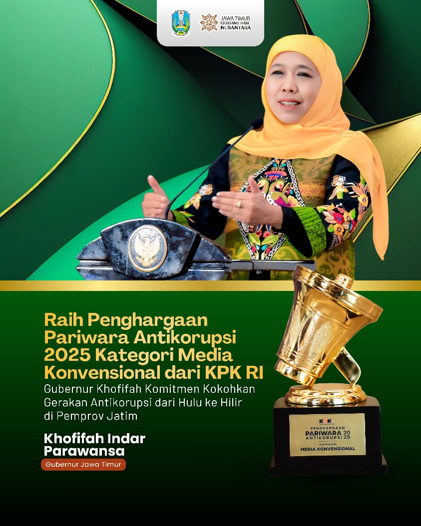 “Alhamdulillah, Pemprov Jawa Timur menerima apresiasi Pariwara Antikorupsi 2025 media konvensional urutan pertama dari KPK RI. Urutan kedua Provinsi DKI Jakarta dan ketiga Kabupaten Demak Jawa Tengah,” ujarnya.