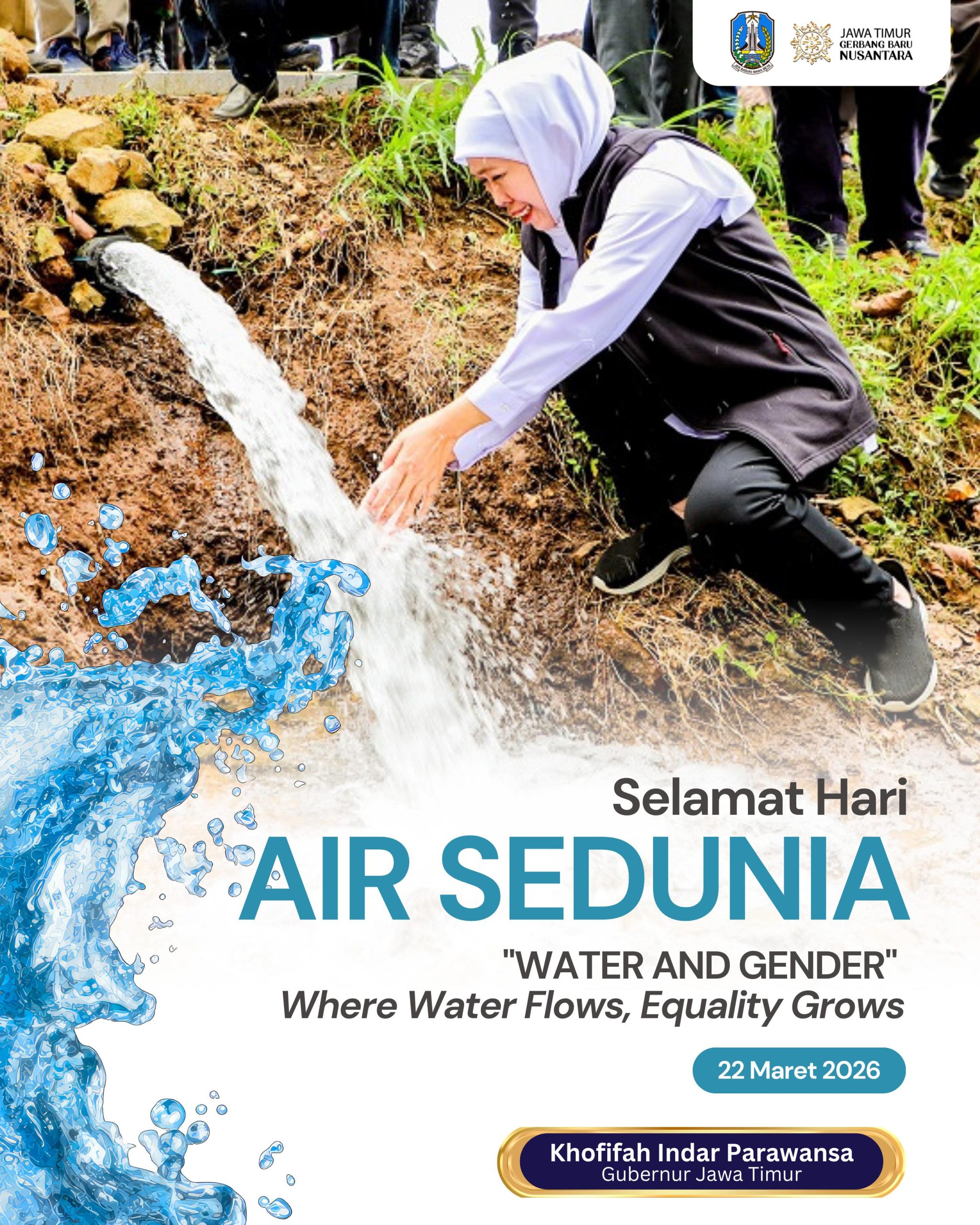 “Hari Air Sedunia menjadi momentum penting untuk meningkatkan kesadaran bahwa air bersih adalah hak asasi manusia. Ketika akses air tersedia secara adil, maka kesempatan untuk hidup sehat, produktif, dan setara juga akan semakin terbuka, khususnya bagi perempuan,” ujar Khofifah.