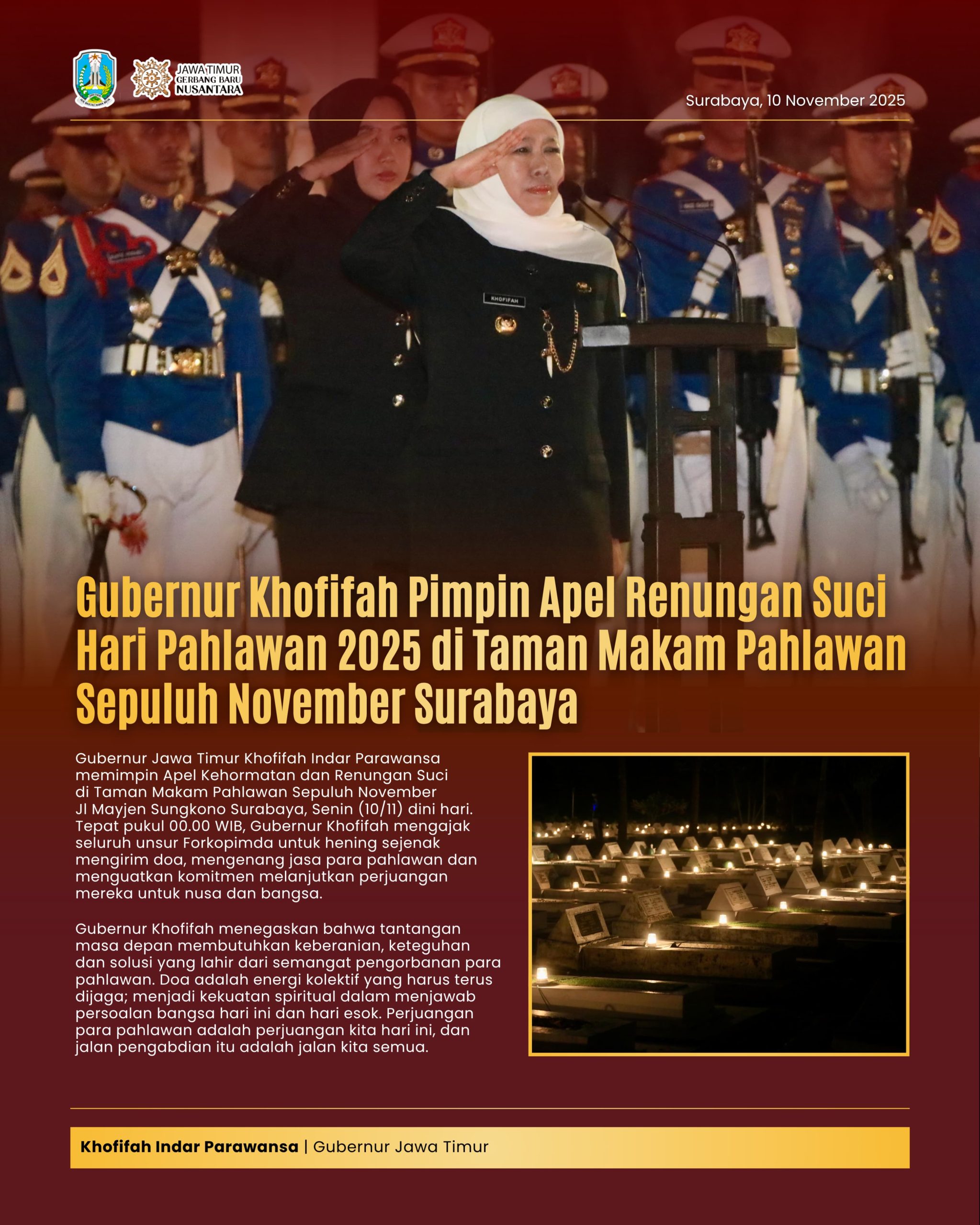 Lentera Post – SURABAYA, 10 NOVEMBER 2025, Gubernur Jawa Timur Khofifah Indar Parawansa, memimpin Apel Kehormatan dan Renungan Suci (AKRS) di Taman Makam Pahlawan 10 Nopember Surabaya, Senin (10/11/2025) dini hari.