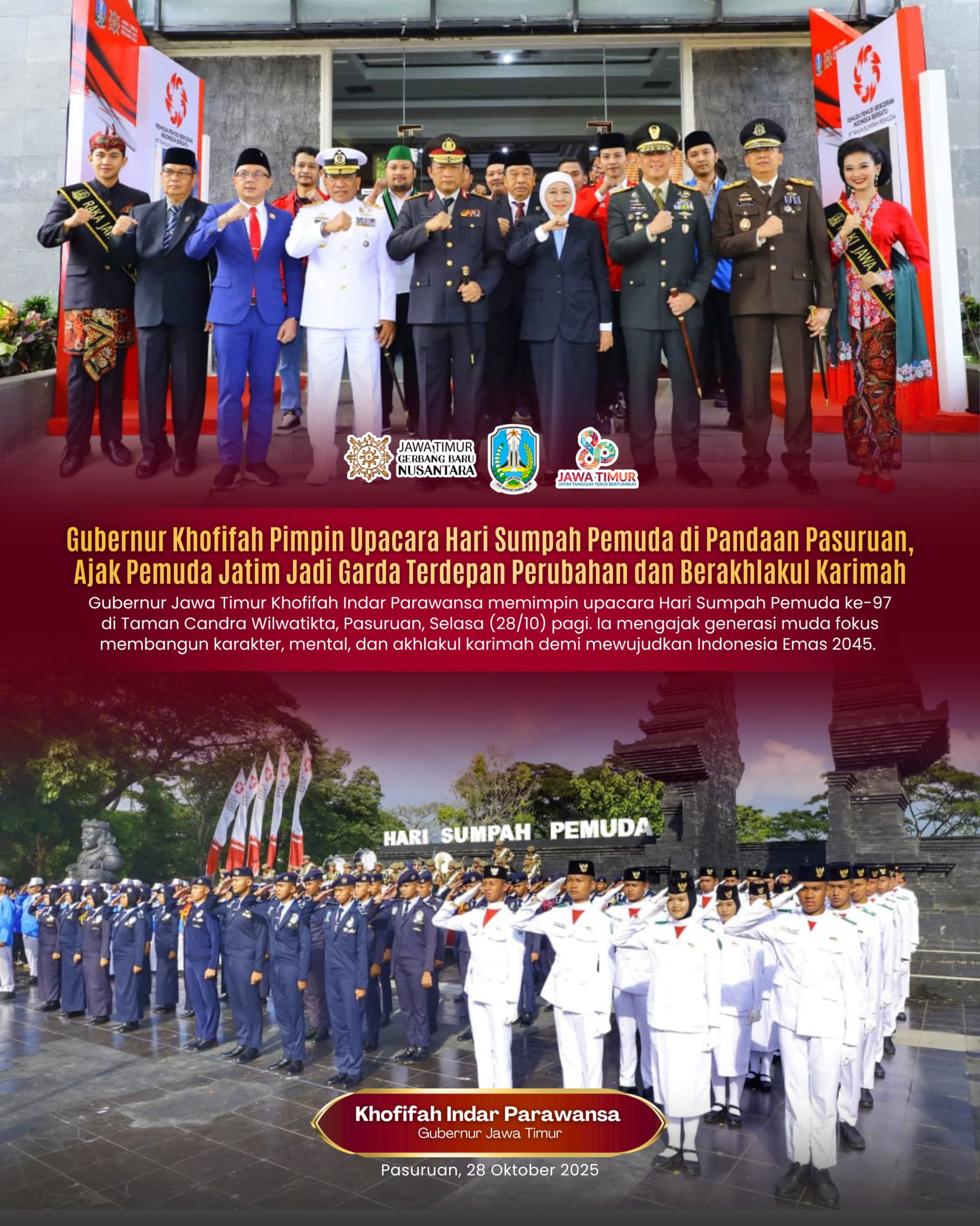 Lentera Post – SURABAYA, 28 OKTOBER 2025, Gubernur Jawa Timur Khofifah Indar Parawansa memimpin langsung Upacara Peringatan Hari Sumpah Pemuda ke-97 Tahun 2025 yang digelar di Taman Candra Wilwatikta, Pandaan, Kabupaten Pasuruan, Selasa (28/10).