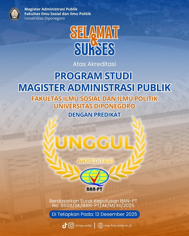 Predikat Akreditasi Unggul tersebut menjadi bukti nyata komitmen Prodi Magister Administrasi Publik Undip dalam menjaga dan meningkatkan kualitas akademik, tata kelola pendidikan, serta pelaksanaan Tri Dharma Perguruan Tinggi secara berkelanjutan. Pencapaian ini sekaligus menegaskan posisi Prodi MAP Undip sebagai salah satu program studi terbaik di bidang administrasi publik di Indonesia.