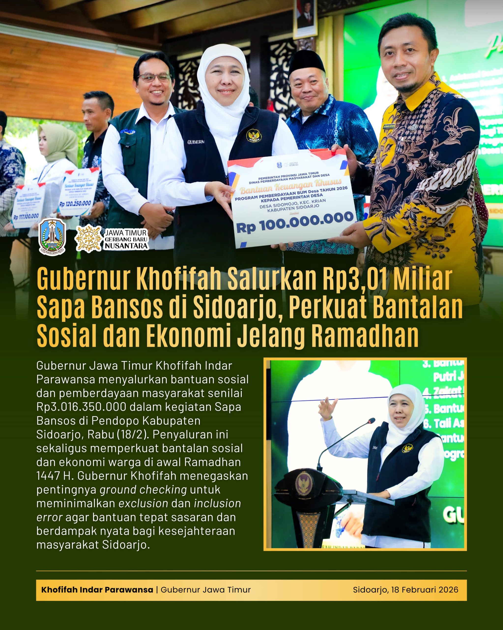 Lentera Post – SIDOARJO, 19 Februari 2026, Gubernur Jawa Timur Khofifah Indar Parawansa menyalurkan bantuan sosial dan pemberdayaan masyarakat desa di Sidoarjo senilai total Rp3.016.350.000 dalam kegiatan Sapa Bansos yang digelar di awal Bulan Suci Ramadhan 1447 Hijriah di Pendopo Kabupaten Sidoarjo, Rabu (18/2).