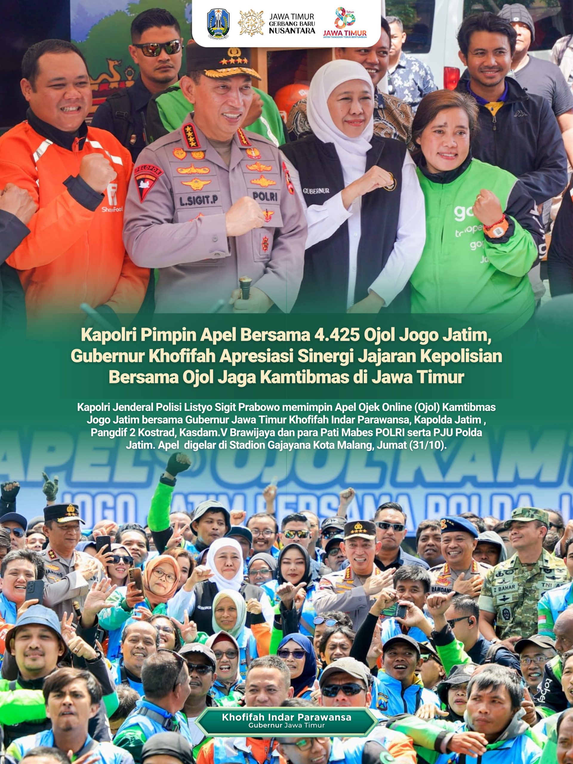 Lentera Post – MALANG, 1 NOVEMBER 2025, Kapolri Jenderal Polisi Listyo Sigit Prabowo memimpin Apel Ojek Online (Ojol) Kamtibmas Jogo Jatim bersama Gubernur Jawa Timur Khofifah Indar Parawansa, Kapolda Jatim , Pangdif 2 Kostrad, Kasdam.V Brawijaya dan para Pati Mabes POLRI serta PJU Polda Jatim. Apel
