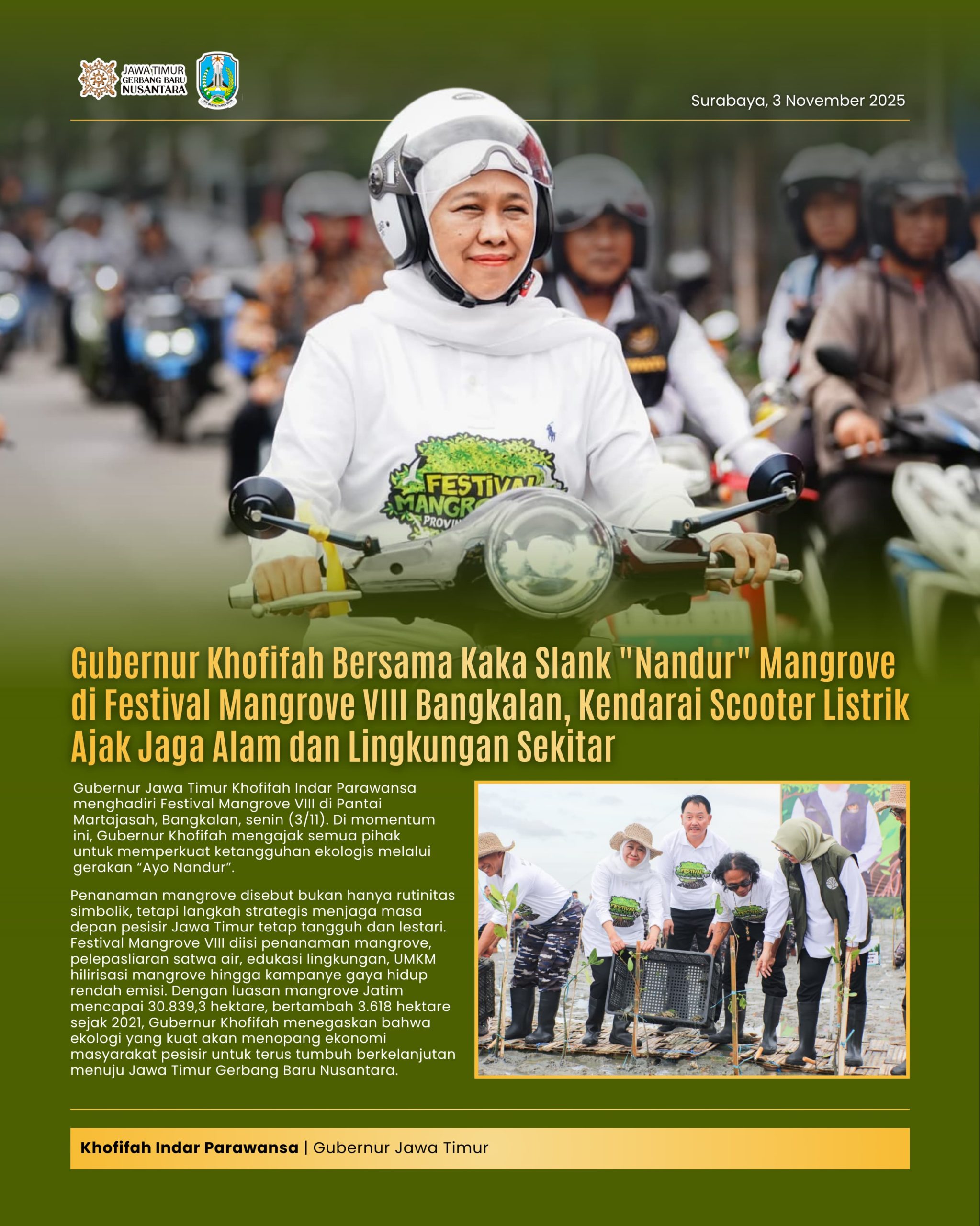 “Melalui program Mangrove Lestari, kita berkomitmen memperkuat ketahanan lingkungan dan berkontribusi nyata terhadap target Net Zero Emission 2060. Ini adalah ikhtiar Jawa Timur untuk menjaga bumi agar tetap lestari bagi generasi mendatang,” tegas Khofifah.