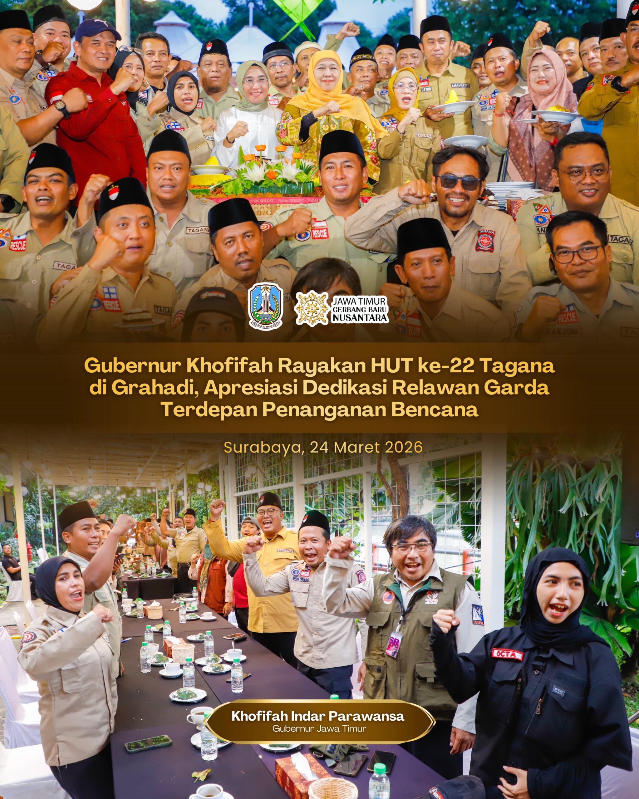 Lentera Post – SURABAYA, 25 MARET 2026, Gubernur Jawa Timur Khofifah Indar Parawansa menggelar tasyakuran HUT ke-22 Taruna Siaga Bencana (Tagana) bersama pilar sosial di Gedung Negara Grahadi, Surabaya, Selasa (24/3).